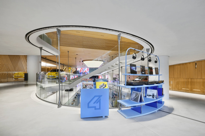 Keskkonnasõbralikku lähenemist rakendades on valgustus minimaalne, rõhutades sisearhitektuuri peenelt, kuid mitte liiga domineerivalt. Sel viisil kinnitab Renault oma staatust viimase autotootjana Champs-Élysées'l, tehes arhitektuurilisi valikuid, mis on küll selged, kuid mitte kunagi üleliia lihtsad. Kuigi rippuv kaldtee püüab kohe pilku, on puidu kasutamine samuti oluline nüanss. Puidu kasutamine lisab teretulnud soojust, parandades akustilist mugavust ja aidates kaasa tasakaalu loomisele minimalistliku esteetika ja sõbraliku atmosfääri vahel.